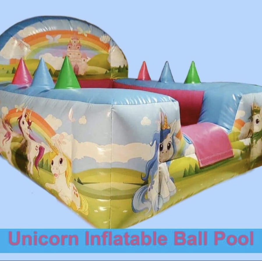 Our unicorn ball pit is gloss pink and blue and has unicorns all over it