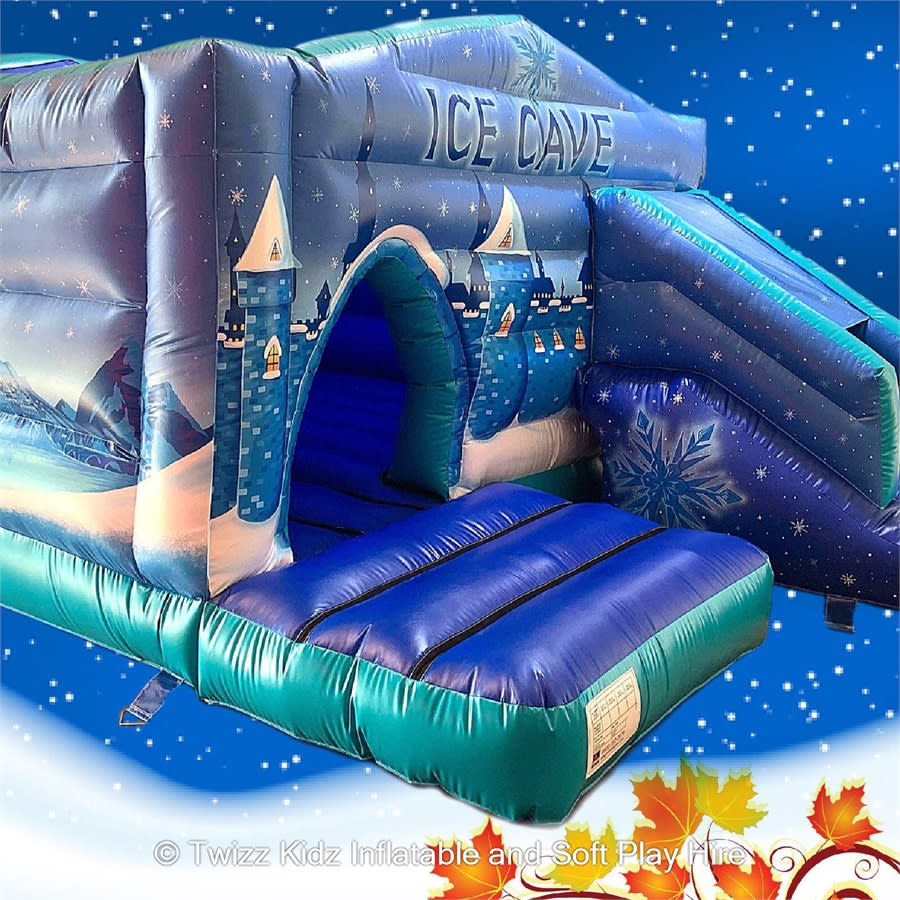 The box design has a large bouncy bed and higher than average walls with a sewn on top-cover. There is an arched entrance and a slide exit. The outer walls has stunning frosty artwork on both sides, featuring a crystal palace on a snowy mountain, a frozen lake and village, snowy trees and a snow filled sky. The front has a magical castle design and a winter woodland design to the inner back wall.