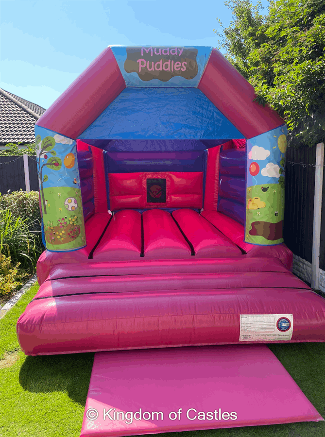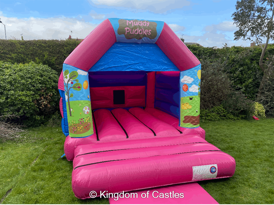 bouncy castle hire 15ft x 11ft Muddy Puddles Castle in Flintshire, Denbighshire, Conwy, Wrexham, Cheshire — Bright, glossy and built for fun. This eye-catching pink and blue Muddy Puddles Castle is perfect for children's parties, family events, and community fêtes. Durable vinyl, vivid colours, and a spacious jumping area make it a crowd favourite. โจ